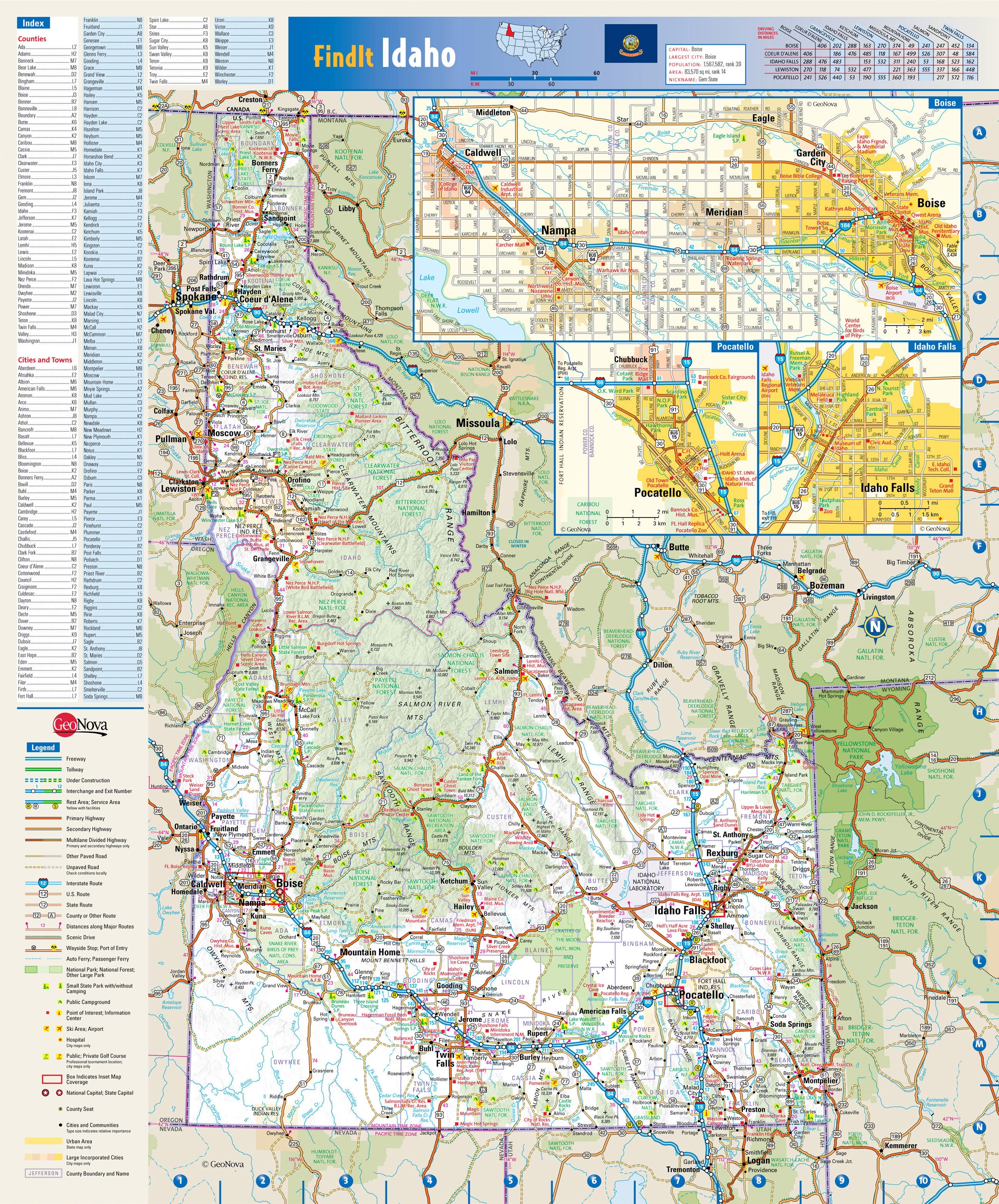 Large detailed roads and highways map of Idaho state with national parks, all cities, towns and villages