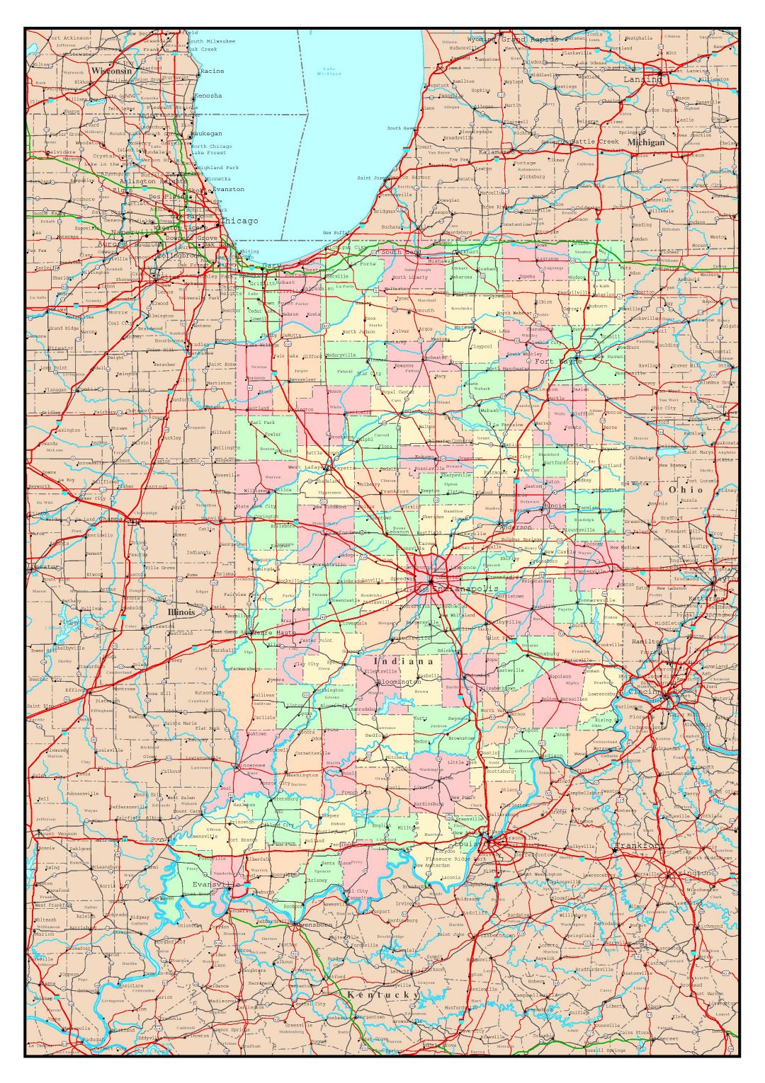 Large detailed administrative map of Indiana state with roads, highways and major cities